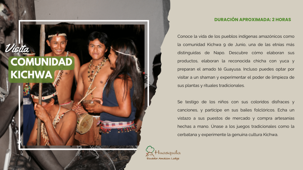 Sumérgete en la cultura Kichwa: descubre tradiciones ancestrales, rituales con plantas, danzas, artesanías y la auténtica vida amazónica en Huasquila Lodge.