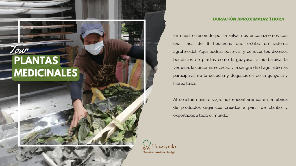 En nuestro recorrido por la selva, nos encontraremos con una finca de 6 hectáreas que exhibe un sistema agroforestal. Aquí podrás observar y conocer los diversos beneficios de plantas como la guayusa, la hierbaluisa, la verbena, la cúrcuma, el cacao y la sangre de drago, además participarás de la cosecha y degustación de la guayusa y hierba luisa. Al concluir nuestro viaje, nos encontraremos en la fábrica de productos orgánicos creados a partir de plantas y exportados a todo el mundo.