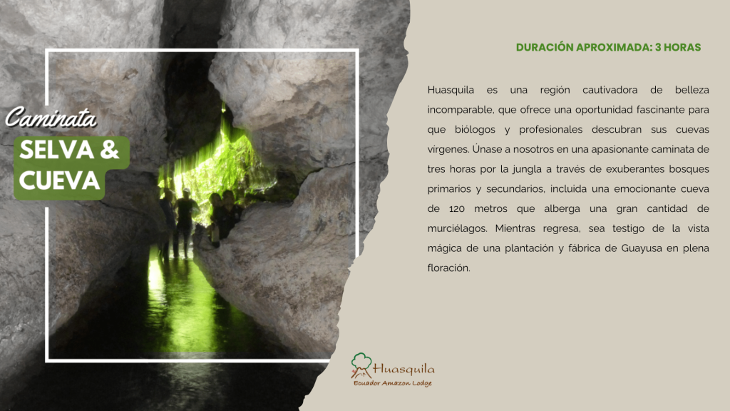 Huasquila es una región cautivadora de belleza incomparable, que ofrece una oportunidad fascinante para que biólogos y profesionales descubran sus cuevas vírgenes. Únase a nosotros en una apasionante caminata de tres horas por la jungla a través de exuberantes bosques primarios y secundarios, incluida una emocionante cueva de 120 metros que alberga una gran cantidad de murciélagos. Mientras regresa, sea testigo de la vista mágica de una plantación y fábrica de Guayusa en plena floración.